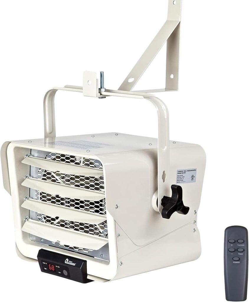This 5000-watt ceiling-mounted heater packs serious heating power for areas like home gyms, single-car garages, or small workshops. It offers three adjustable heat levels so you can control warmth based on how cold it gets, and the fan-forced design ensures even heat distribution across the space. Being hardwired, it delivers a steady, consistent heat output without relying on portable setups or worrying about tipping hazards. With a rugged, durable build designed for utility spaces, this unit is made for harsh winters. Its ceiling-mount design keeps floor space free, while the adjustable thermostat helps maintain a comfortable temperature. Perfect for anyone wanting a heavy-duty yet simple solution to keep their garage or workspace warm all winter long.